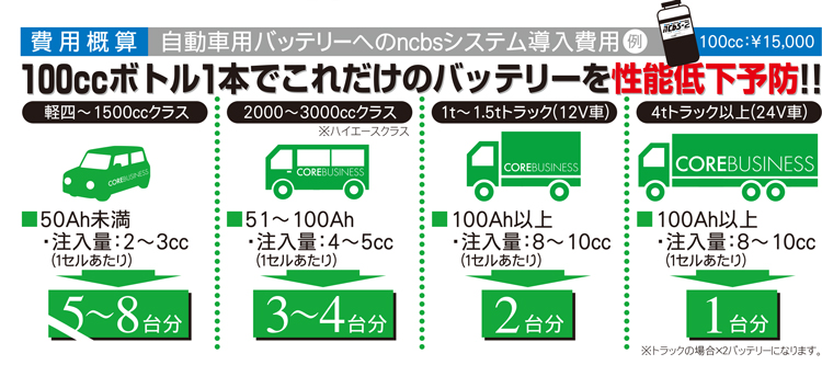 導入実績では、廃棄対象となっていた鉛蓄電池にncbsを加え、緊急車両に使用している例があります。ncbs添加後1年半を過ぎても、新しいものと同じパフォーマンスを続けています。