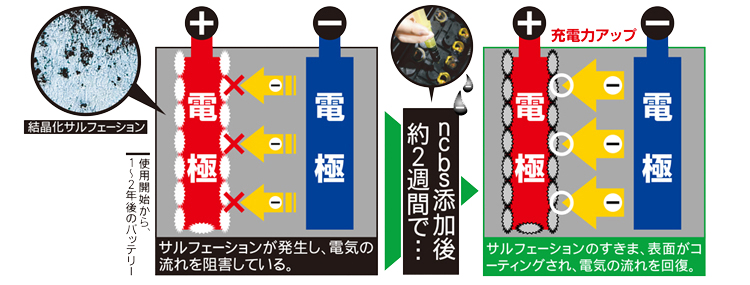 使用開始から2年以内の鉛蓄電池であれば、ほぼ100%の確立でncbsの添加によって新しいものと同じ性能を発揮します。